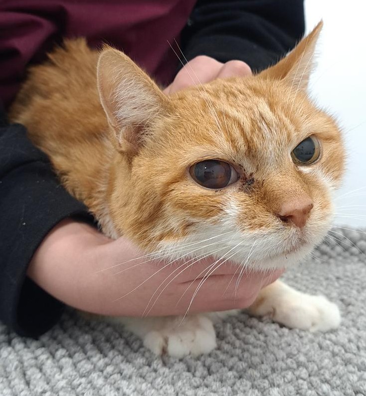 Aufgrund des Bluthochdrucks ist Rambo leider erblindet. Das hindert ihn aber nicht daran, Freude am Leben zu haben. Ansonsten ist Rambo kerngesund, die Leberwerte sind normal und auch die Schilddrüse ist ok. Trotzdem wollte der Besitzer Rambo nicht zurückhaben und hat ihn einfach in der Tierarztpraxis zurückgelassen.