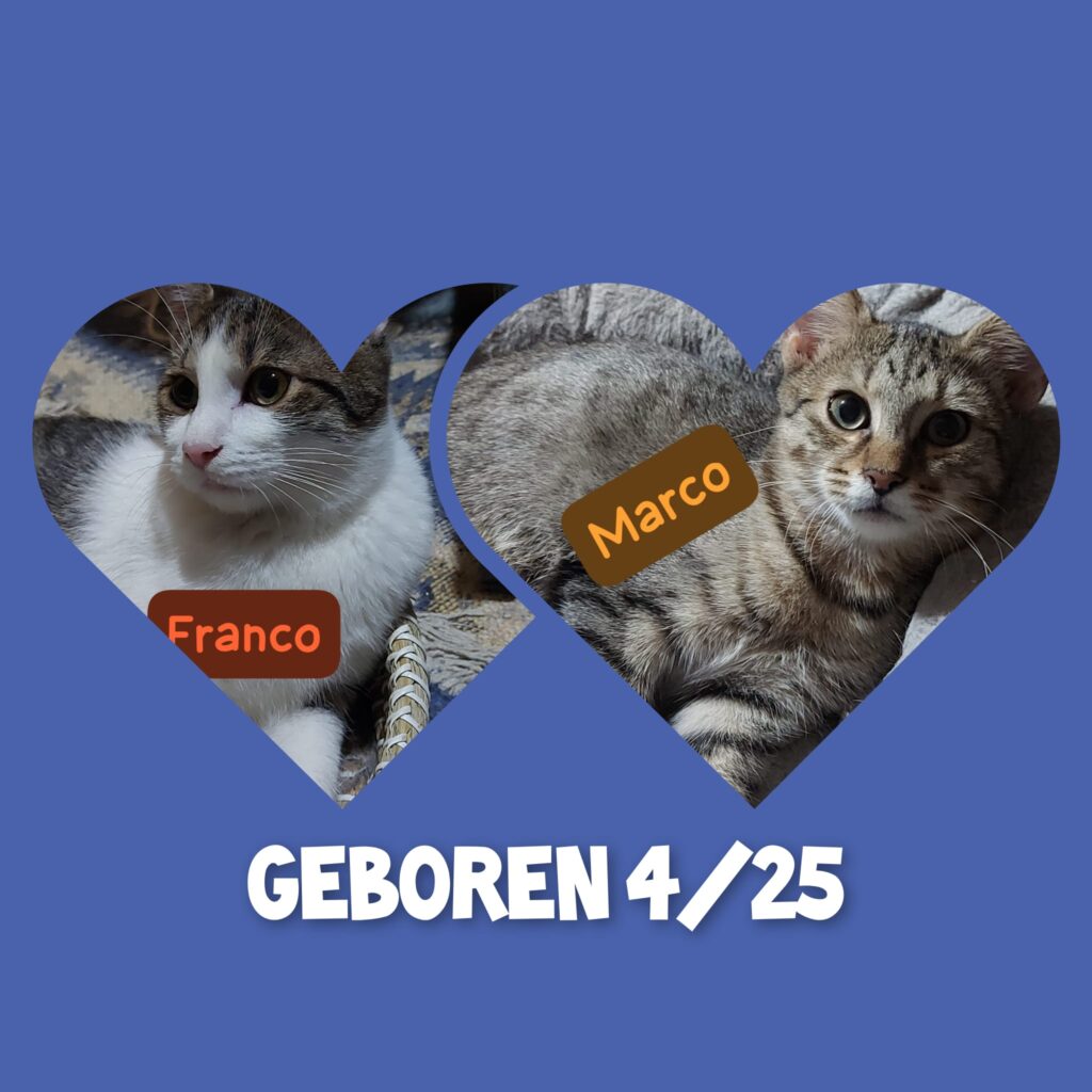 Kater Franco u. Marco sind ca. im Mai geboren. Sie sind gechipt, geimpft ,entwurmt und entfloht und getestet und kastriert.